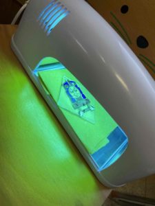 プラバンに好きなキャラクターを描いて⇒プラバンを縮めて⇒レジンを付けてプックリ感を出して⇒硬化で完成✨