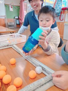 ピンポン玉を取ることに夢中になりすぎて、紙コップの中がピンポン玉でいっぱいになり、上の穴から溢れ落ちてしまう子どももいました😂