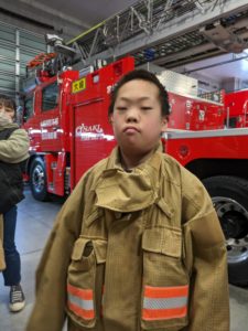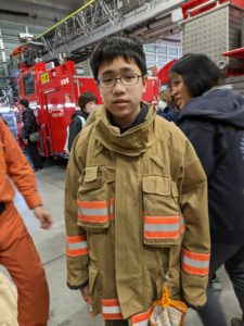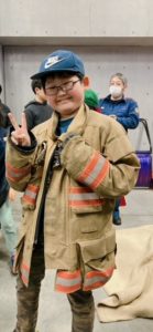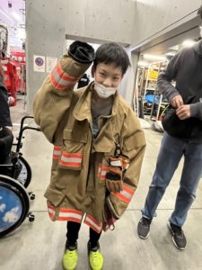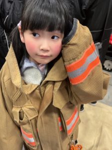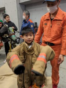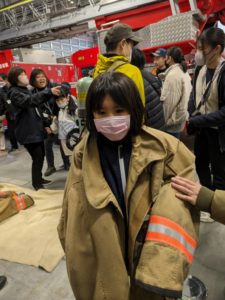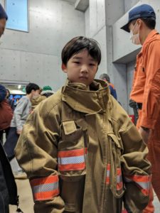 次に盛り上がったのが、実際に消防士さん達が着ている服を着てみる体験です🧥